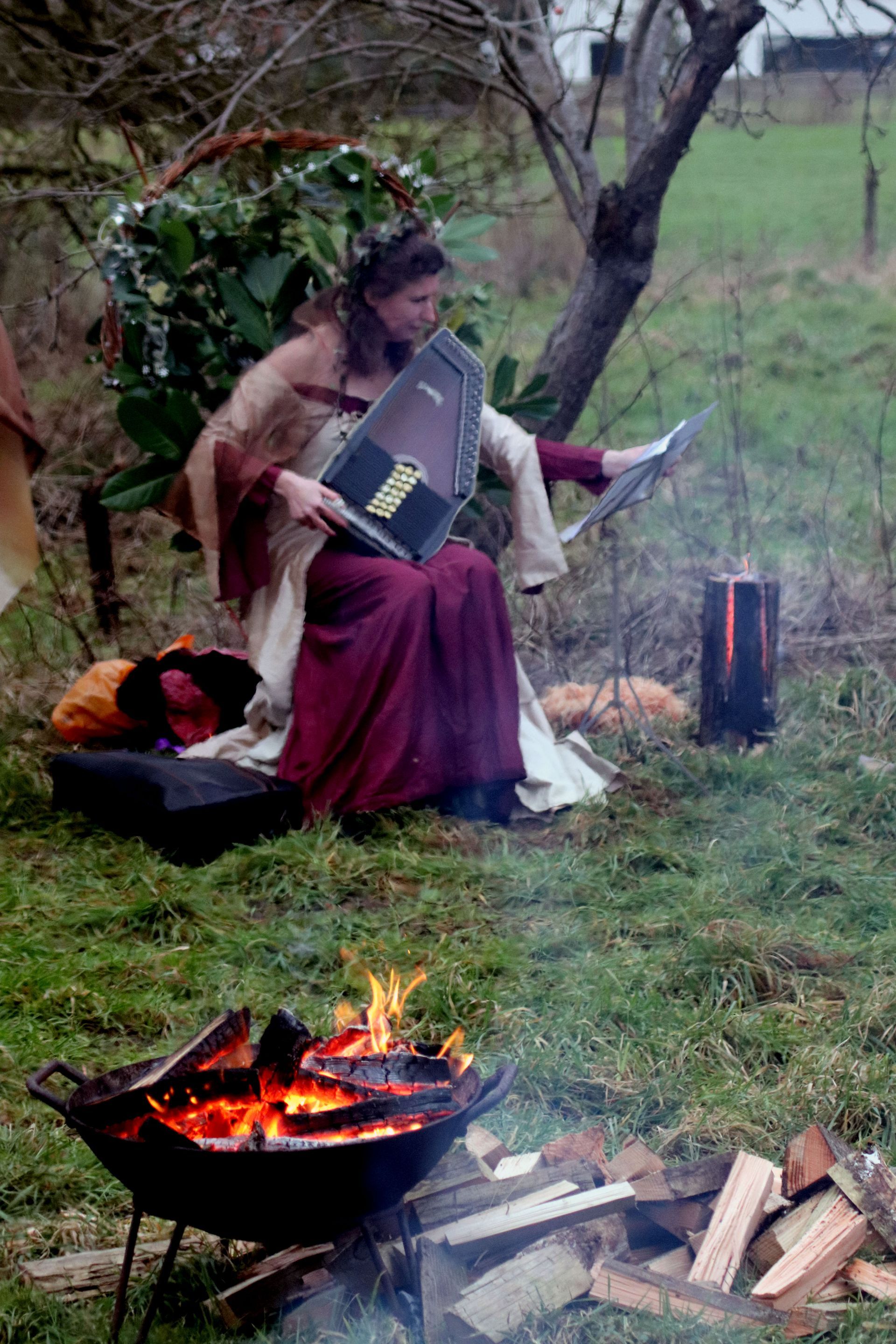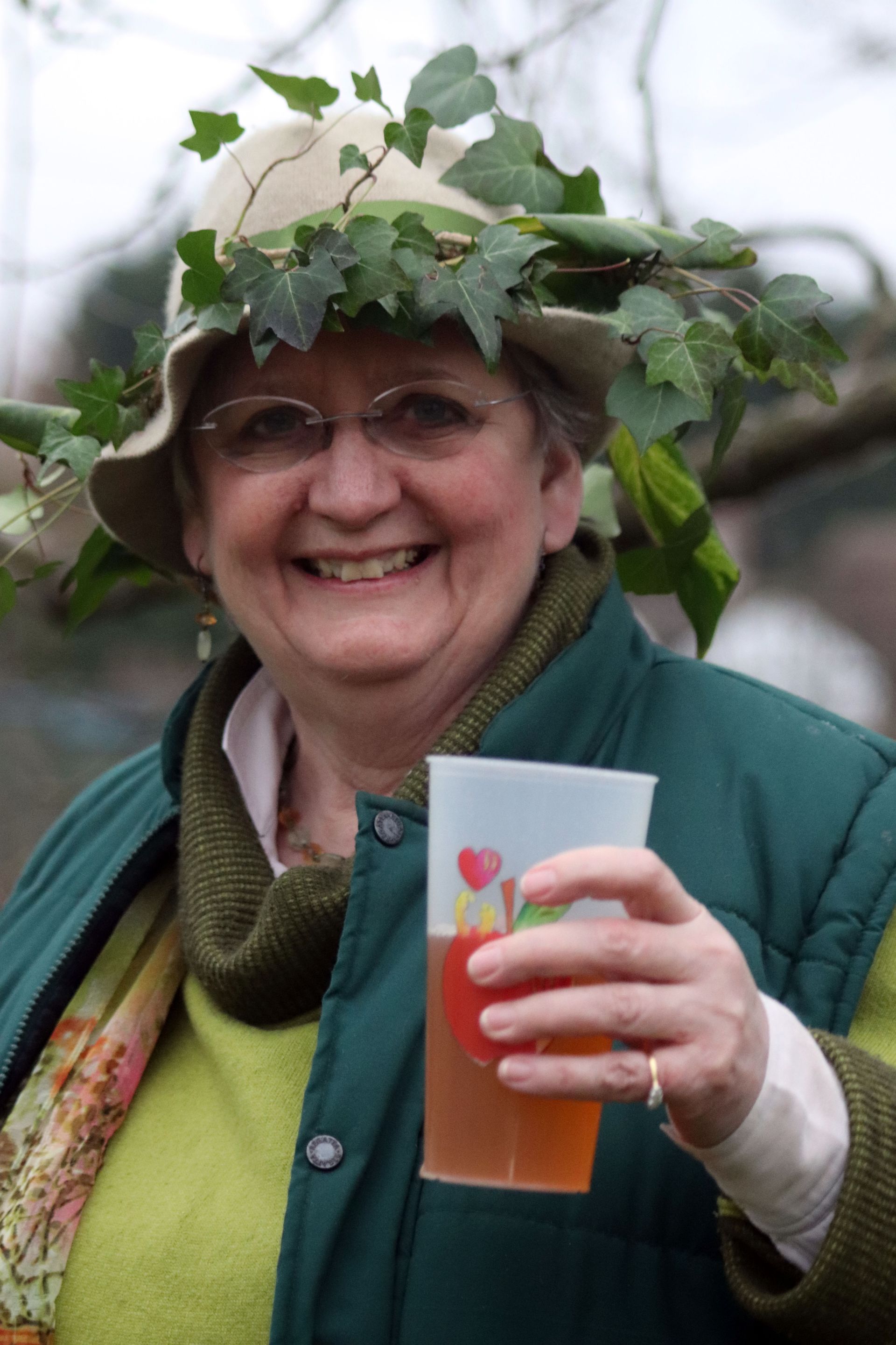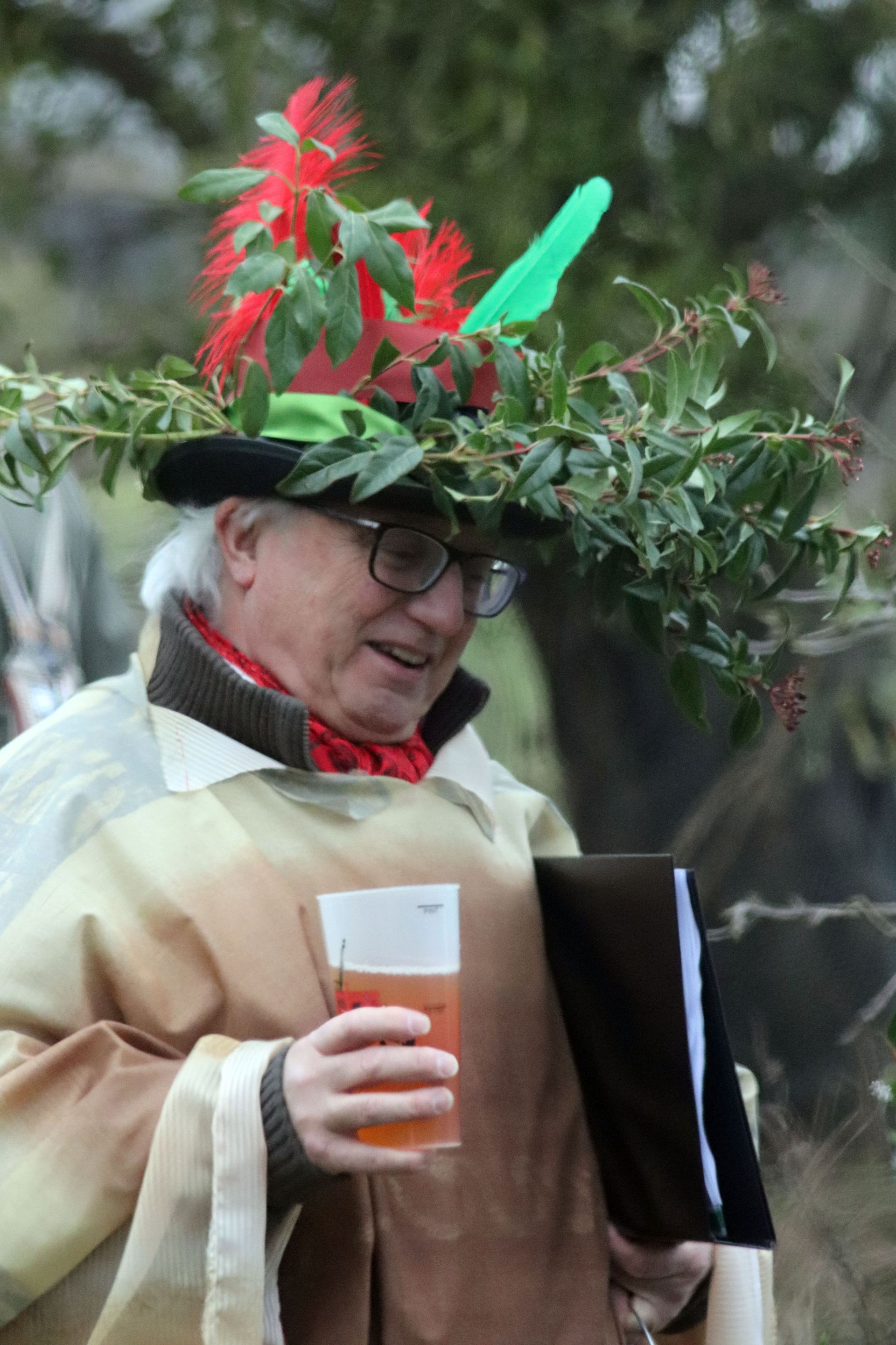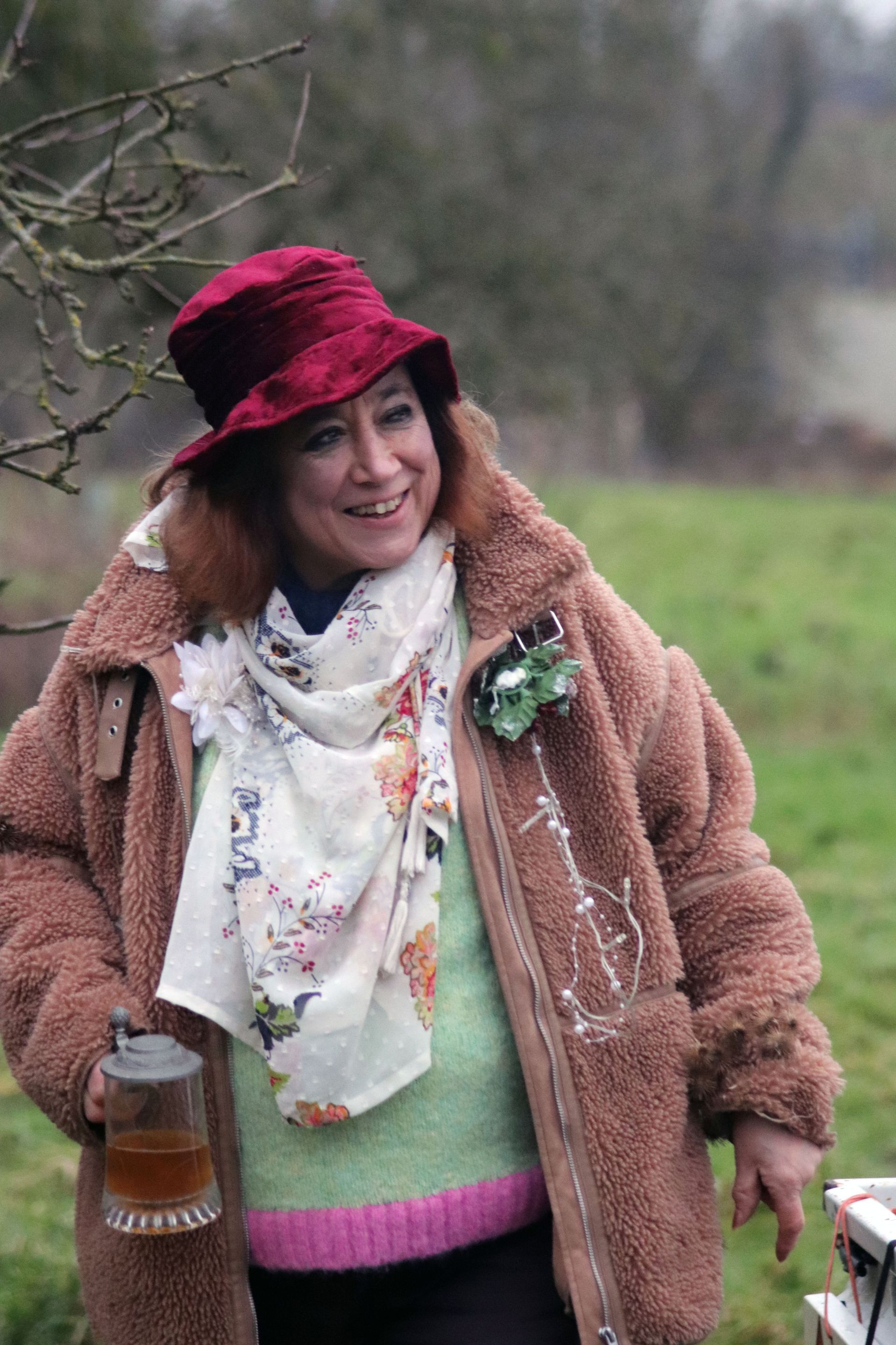 After singing a round there was a short ceremony with 'Malus' (The Apple) speaking on behalf of the trees, dormant, anticipating Spring and new life. Steventon’s Wassail 'Monarch' responded promising that the people would always protect and tend the trees and their fruit.